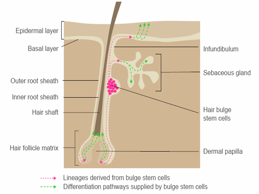 Kulit manusia terdiri dari beberapa lapis. Seiring dengan bertambahnya usia, maka lapisan kulit yang paling luar (sering terkena sinar matahari / sinar UV) akan sedikit demi sedikit mati, sehingga menimbulkan keriput. Sel mati ini sedikit demi sedikit akan mendesak ke dalam sampai ke lapisan dalam. Fungsi dari Stem Cells adalah memperbaiki sel-sel yang masih aktif untuk mendesak keluar memperbaiki sel kulit luar yang berangsur-angsur mati, sehingga kulit luar bisa segar dan tidak keriput.